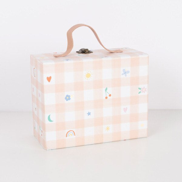 - The pink gingham suitcase is crafted from thick board, with a leather handle and a burnished brass closure