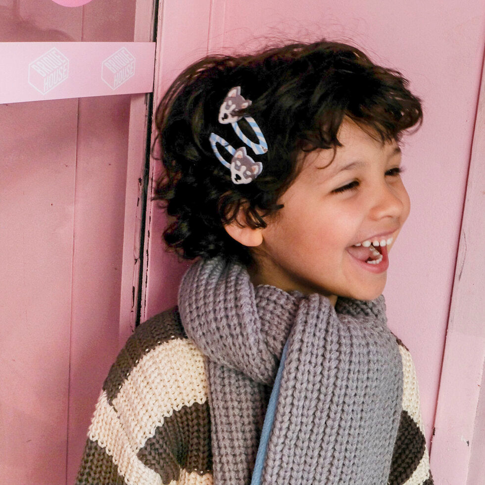 Our loyal snow pup is the perfect buddy to any winter adventures! Two gorgeous grey huskies with bright blue eyes, perky ears and a glitter nose are sat on blue and white stripy ribbon wrapped snap clips. They're so paw-some they will have you howling with joy!