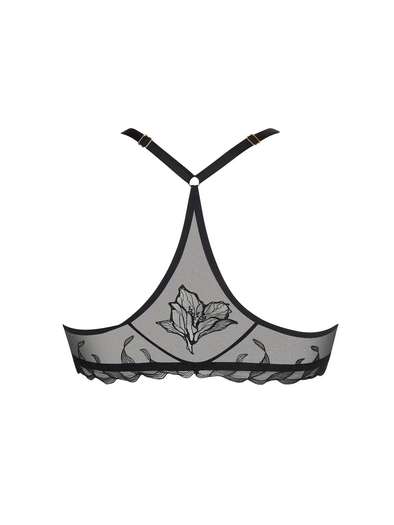 The Désir et Volupté collection by Lise Charmel is the epitome of seductive French lingerie, where refined lace and intricate embroidery meet bold sensuality. Crafted for those who adore luxurious details and elegant allure, this range features sheer fabrics, floral motifs, and striking cuts that enhance and celebrate the feminine form. Triangle cup in embroidered tulle with scalloped edging at the front and sides, enhanced with organza inlays and lined with mesh at the base of the bust The scalloped embroidered basque features an elongated cut-out in crystalline tulle at the center back, adorned with an embroidered floral motif The center gore opens with an elegant gold-tone clasp A gold-tone jewel detail enhances the strap base